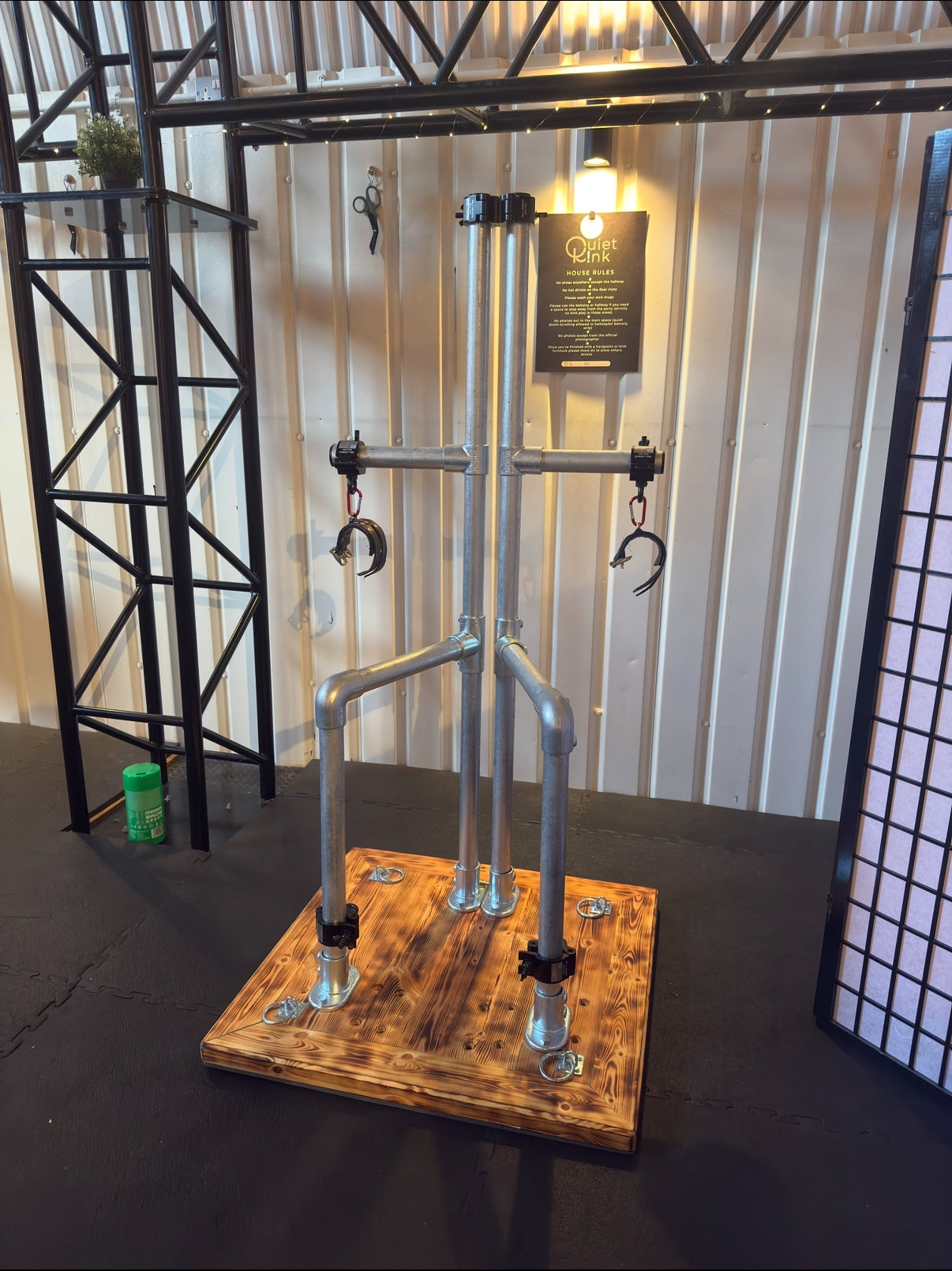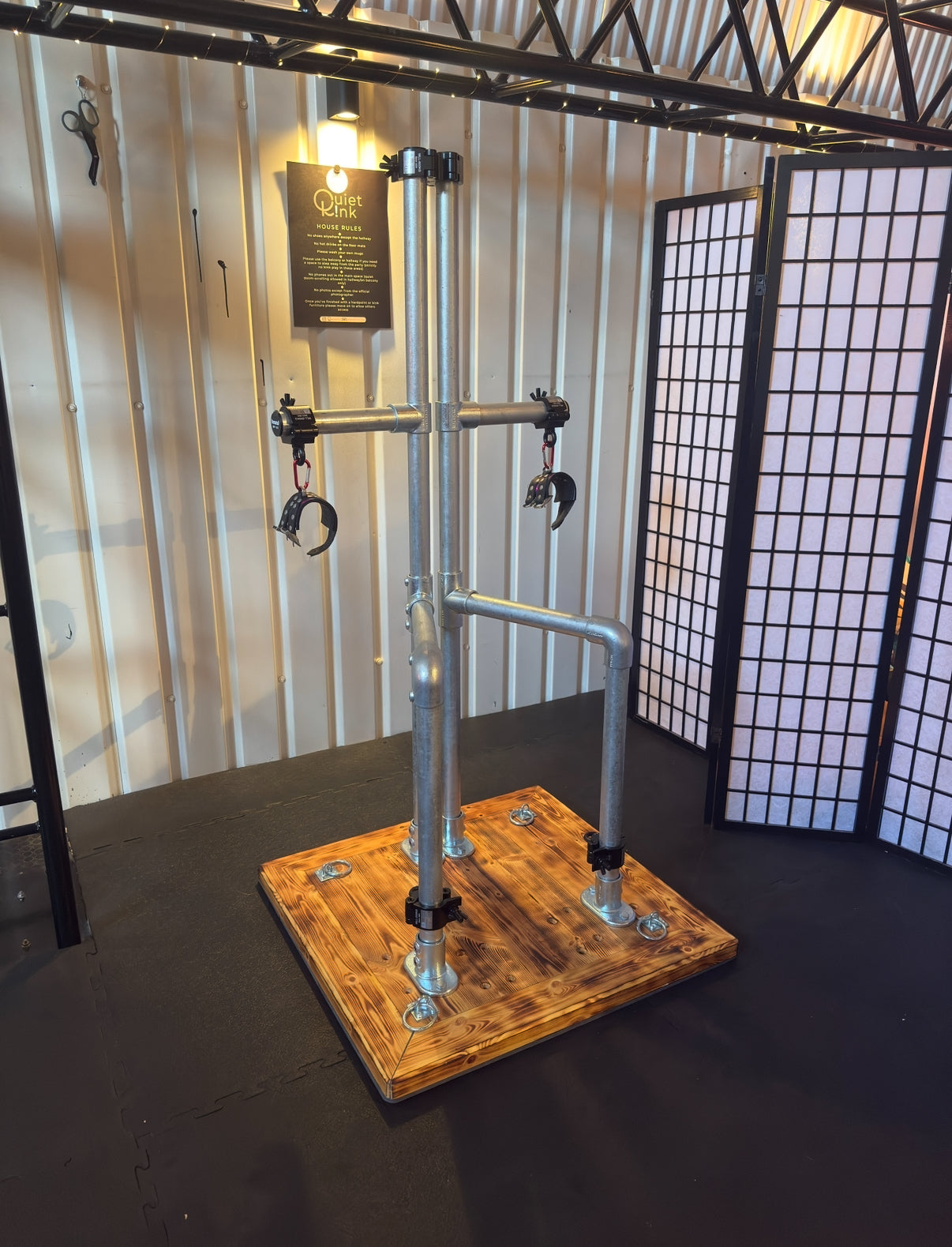 The Frame is where structure meets surrender. Built with raw scaffold steel and a smooth wooden base, this chair is designed to hold you exactly where they want you. Industrial, unapologetic, and ready for anything, it’s a statement piece for serious play.